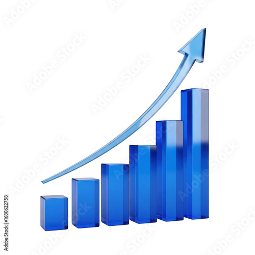 Glowing blue bar chart with upward trend arrow isolated on transparent background