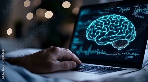 Glowing blue brain hologram on laptop screen with person working in dark room, neural activity waves and medical data visualization for neuroscience research.
