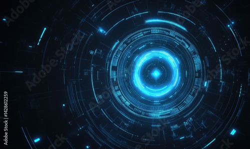 Glowing blue circular energy field with concentric rings and digital elements