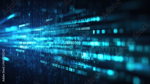 Glowing blue data streams move swiftly through a digital landscape, creating a vibrant, futuristic atmosphere. The scene evokes feelings of speed and connectivity in a tech-driven world.