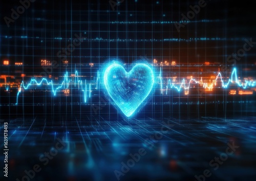 Glowing blue digital heart with surrounding fluctuating electrocardiogram lines on a futuristic grid background conveying heart health and technology integration