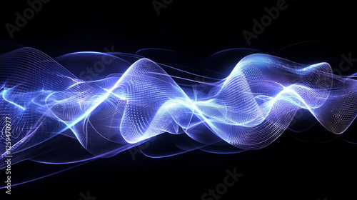 Glowing blue energy flows in a wave pattern against a stark black background, creating a futuristic abstract design -ai