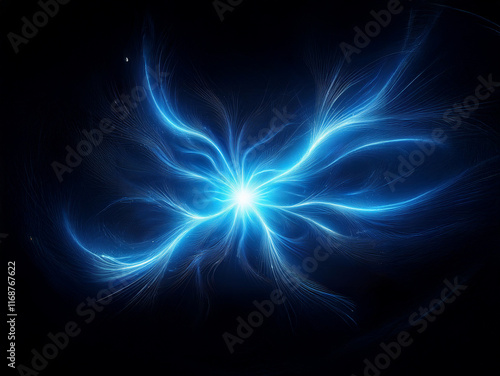 Glowing blue energy streams emanate from a bright central point, creating a dynamic, abstract design against a dark background. The image evokes feelings of power and mystery.