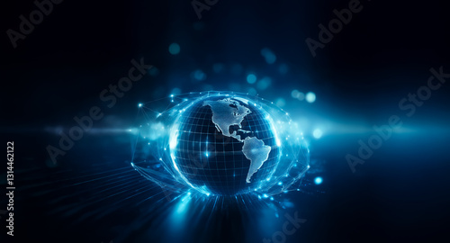 Glowing blue globe with light streaks and bokeh on a dark background. Suggests a futuristic, technological, or connected world.