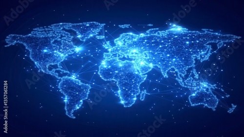Glowing blue network lines forming a world map on a dark background. Abstract digital illustration of global connectivity.