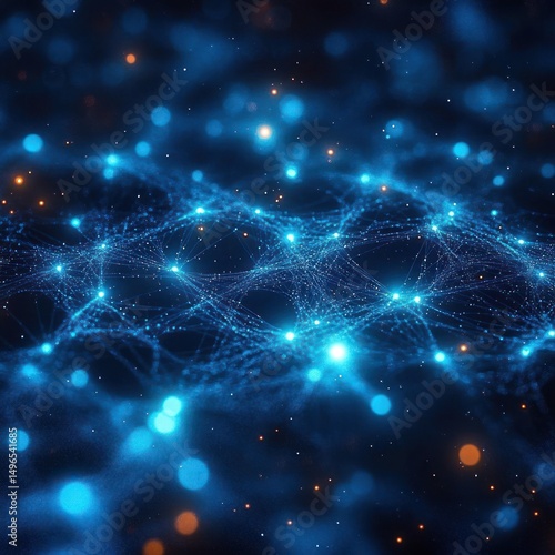 Glowing blue network of interconnected points with a luminous grid pattern set against a dark blurred background with scattered orange and blue light spots