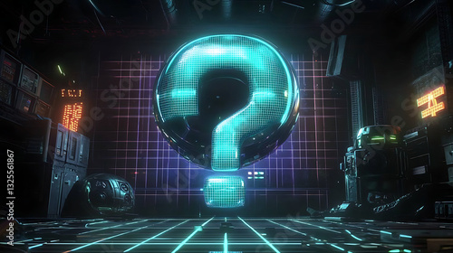 Glowing Blue Question Mark Hologram Against High Tech Circuit Board Background
