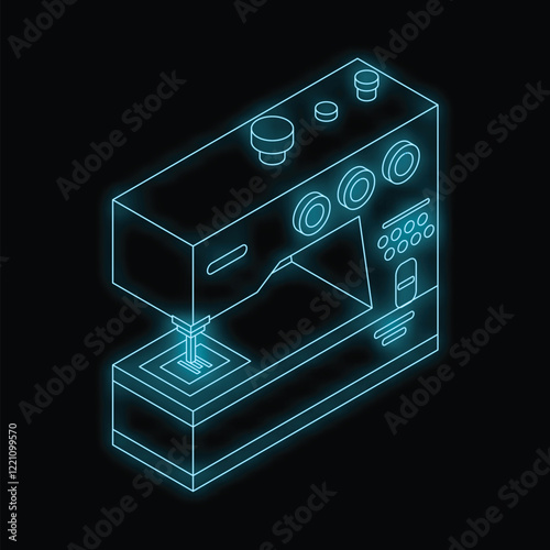 Glowing blue sewing machine icon on a black background representing tailoring