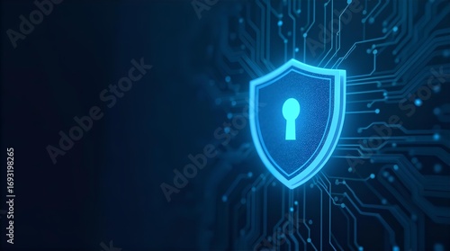 Glowing Blue Shield with Keyhole on Dark Circuit Board Background Digital Cybersecurity Data Protection and Online Information Security Concept
