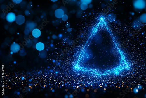 glowing blue triangular shape surrounded by sparkling lights creates magical atmosphere. dark background enhances vibrant blue hues, evoking sense of wonder and enchantment