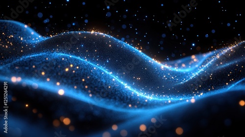 Glowing blue wave, dark space, particles, abstract background, digital art