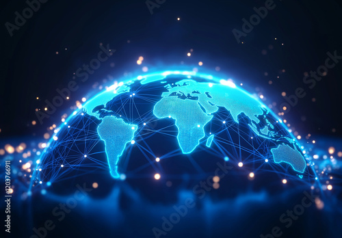 glowing blue world map with global network, showcasing interconnected continents and vibrant lights. This represents digital connectivity and global communication