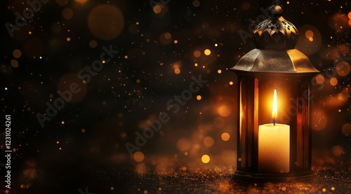 Glowing candle in antique lantern on dark background with bokeh lights.