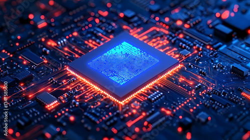 Glowing Chip on Circuit Board with Red and Orange Lights