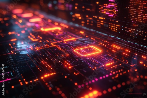 Glowing Circuit Board, Data Stream, Futuristic Tech, Abstract Background, Stock Photo