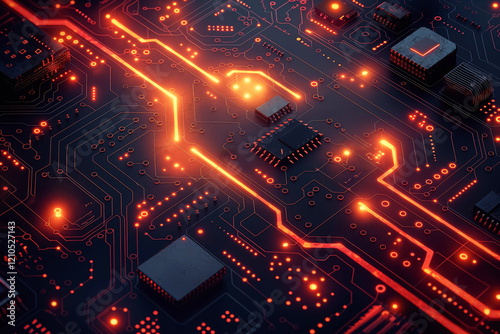 Glowing circuit board with futuristic red neon lights and microchips