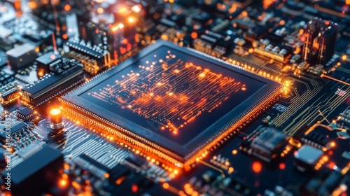 Glowing circuit board with orange light, intricate pathways, and advanced technology components