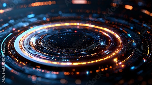 Glowing circular light trails with orange and blue bokeh effects create futuristic technology concept against dark background, suitable for digital transformation themes.