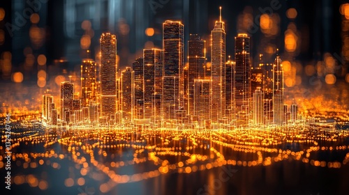 Glowing city skyline with intricate digital network, warm lights on a dark background