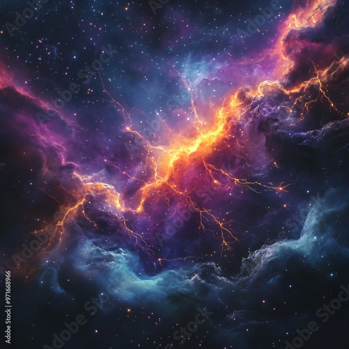 Glowing cosmic nebula background filled with stardust, gases, and star formations