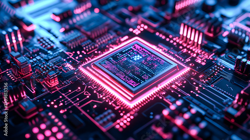 Glowing CPU Circuit Board Futuristic Technology Pink Blue Neon Lights Digital Data Processing
