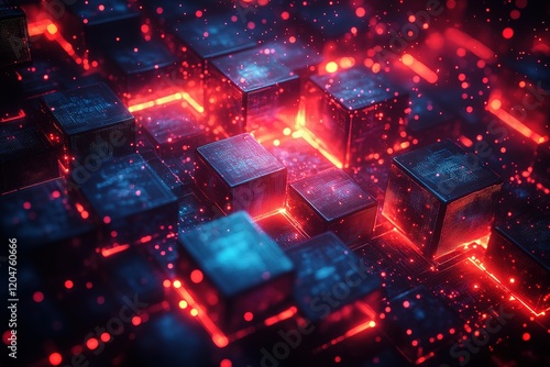 Glowing Cubes in a Network. Abstract digital art depicting interconnected data blocks.