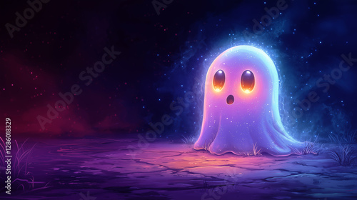 Glowing cute ghost with big eyes in a magical night scene, copy space