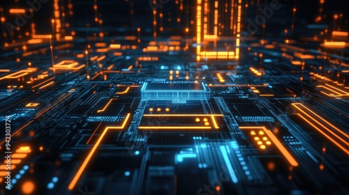 Glowing digital circuit board with cyber effects