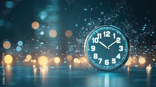 glowing digital clock surrounded by sparkling lights in futuristic cityscape