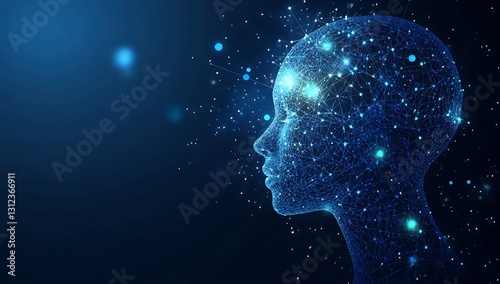 Glowing digital head silhouette surrounded by bright nodes and lights representing advanced technology and AI : Generative AI