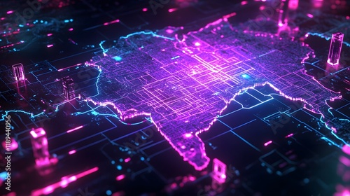 Glowing digital map, circuit board, city, network, data flow, technology, future, abstract, background, website