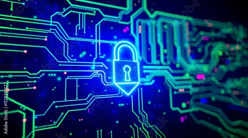 glowing digital padlock on a futuristic blue circuit board background