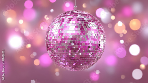 Glowing disco ball with pink and purple mirrored tiles surrounded by sparkling bokeh lights creating festive and vibrant atmosphere
