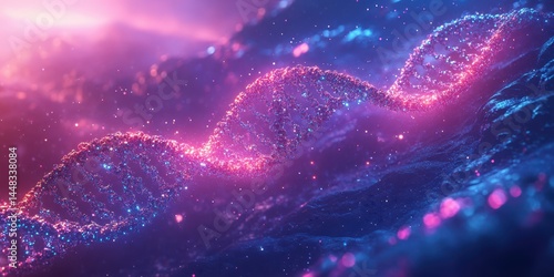 Glowing double helix structure surrounded by ethereal particles in a cosmic environment during twilight hours