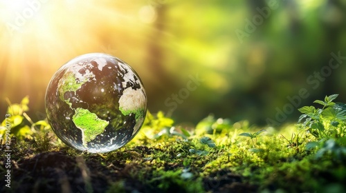 Glowing Earth Globe Surrounded by Lush Greenery Under a Bright Sunlight in Nature