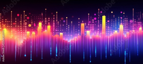 Glowing Financial Chart. Abstract City Skyline With Colorful Equalizer. Data Analysis Background.