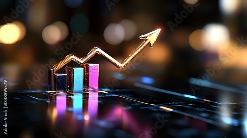Glowing financial chart with upward trending arrow shows business growth on dark background with colorful neon lighting and bokeh effect. Modern data visualization.