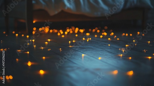 Glowing fireflies hovering in dark bedroom creating magical atmosphere, symbolizing insomnia, restless nights and dreamy thoughts. Concept of sleep disorder and nocturnal wonder.