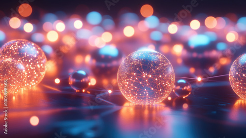 glowing floating matrix of connected spheres creates mesmerizing visual effect, showcasing intricate patterns of light and connection. vibrant colors and ethereal glow evoke sense of wonder and