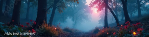 Glowing flora illuminates foggy forest, mystical scene , mist, plants, surreal