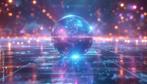 輝く未来:サイバーパンク風の抽象的な球体とネオンライトの幻想的な風景、Glowing Future - A Cyberpunk Abstract Sphere and Neon Lights in a Dreamy Landscape