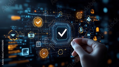 Glowing futuristic high tech digital interface with checkmark icon held by a hand surrounded by certification and symbols against a dark background with blue and yellow accents