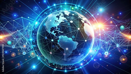 Glowing globe surrounded by futuristic dots and icons, symbolizing interconnected global communication networks, digital technology, and international connections on a vibrant, abstract background.