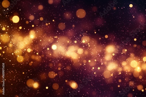 Glowing golden and orange bokeh lights with scattered small particles on a dark purple background creating a warm, magical, and festive atmosphere