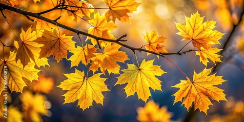 Glowing golden maple leaves adorn the branch, a symphony of fall.