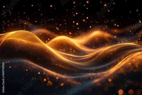 Glowing Golden Waves Of Abstract Particles In Dark Space