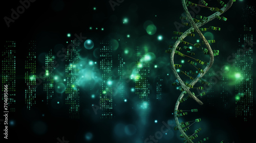 Glowing green code weaves through human DNA, showcasing marriage of science and digital innovation