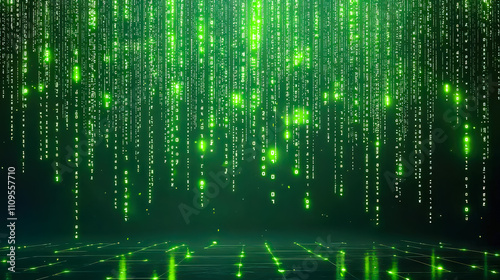 Glowing green lines descend from above, creating a digital rain effect against a dark backdrop, evoking a technological ambiance