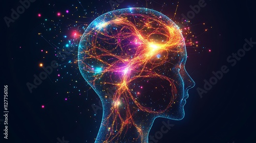 Glowing head profile with colorful energy streams, representing intelligence and creativity.