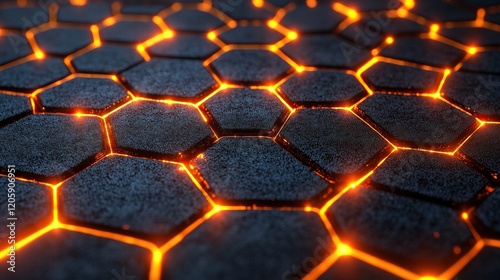 Glowing hexagons surface with fiery edges, dark background. Ideal for tech, gaming backgrounds